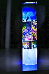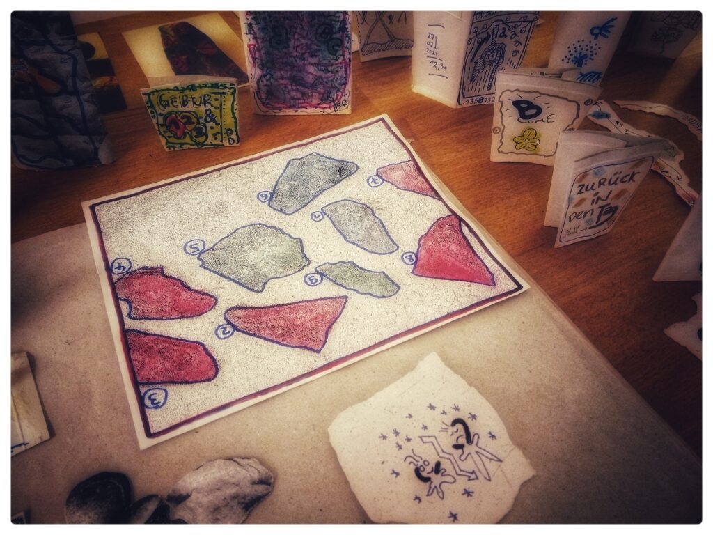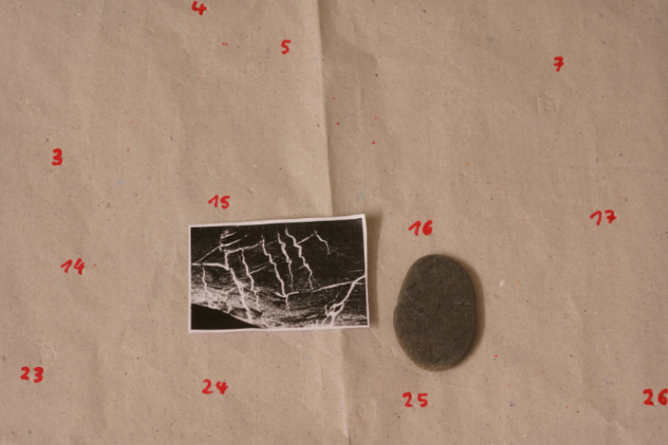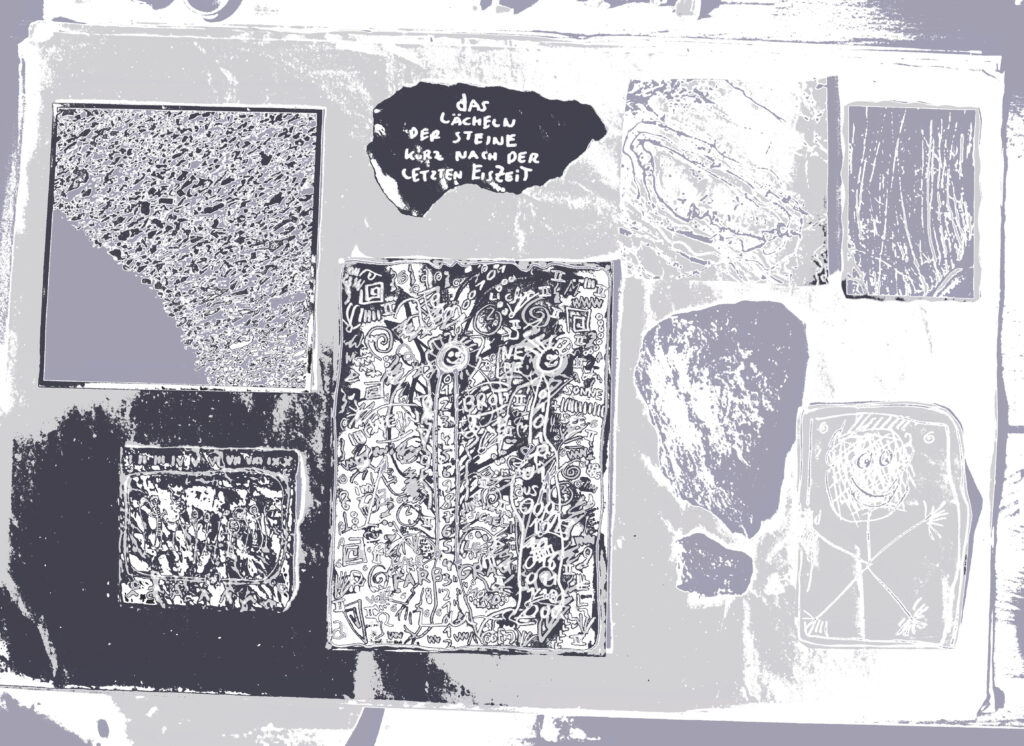 Von Links Oben nach Rechts unten: Lago de Canèe, von Barbighéi aus gesehen an einem sehr kalten Oktobermorgen 2021, Textfragment aus der Lampenfabrik am Kanzleiweg, Detail aus Steinstudie 2025 von Itre de Bouis bei Derborence, Detail eines Steins aus der Tamina bei Bad Ragaz, Skizze 10 aus der Lampenfabrik, DinA4 einer Morgenzeichnung mit Julian, zwei Verrucano-Steine aus Tierget bei Plons, Seeztal und noch das lachende Männlein aus der Zehnfensterkapsel des gelben Hauses.